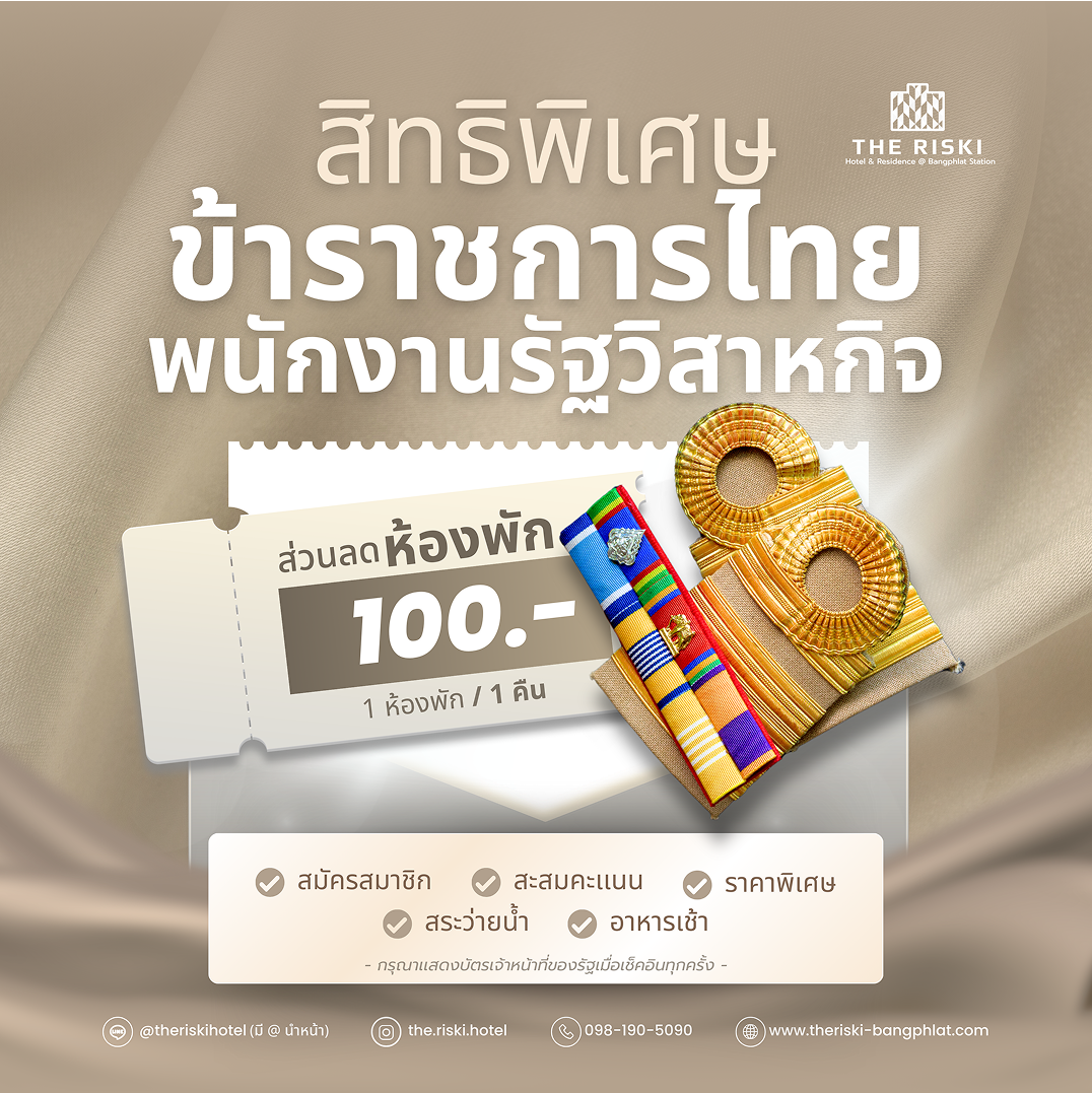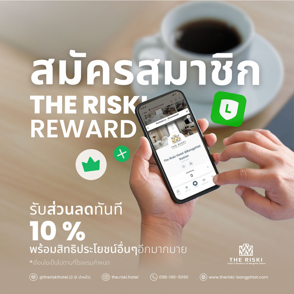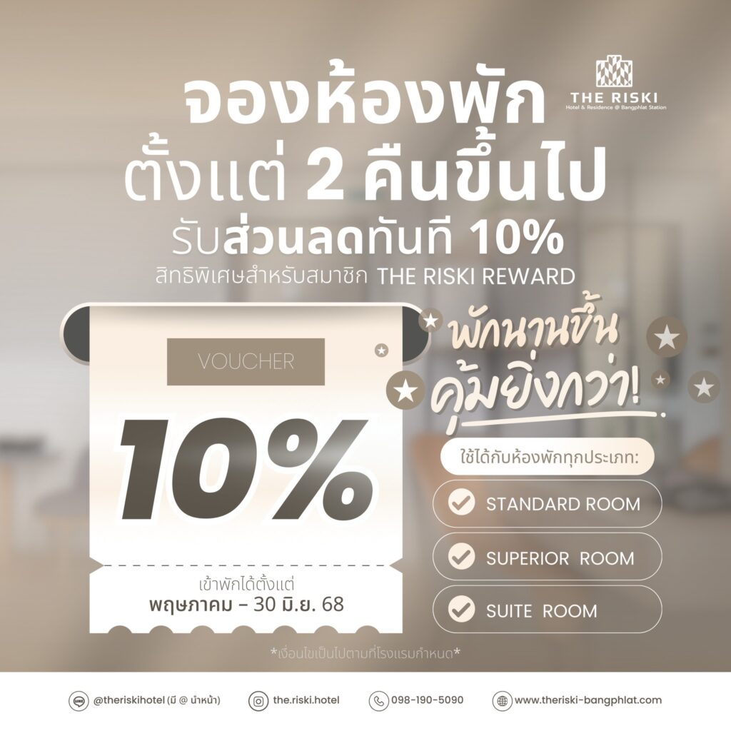 สมาชิก THE RISKI REWARD รับส่วนลดพิเศษ ทันที 10% เมื่อจองห้องพัก ตั้งแต่ 2 คืนขึ้นไป